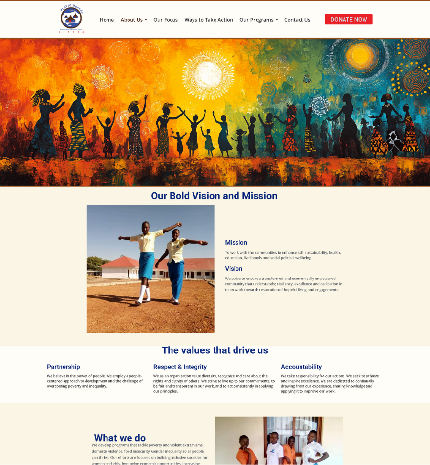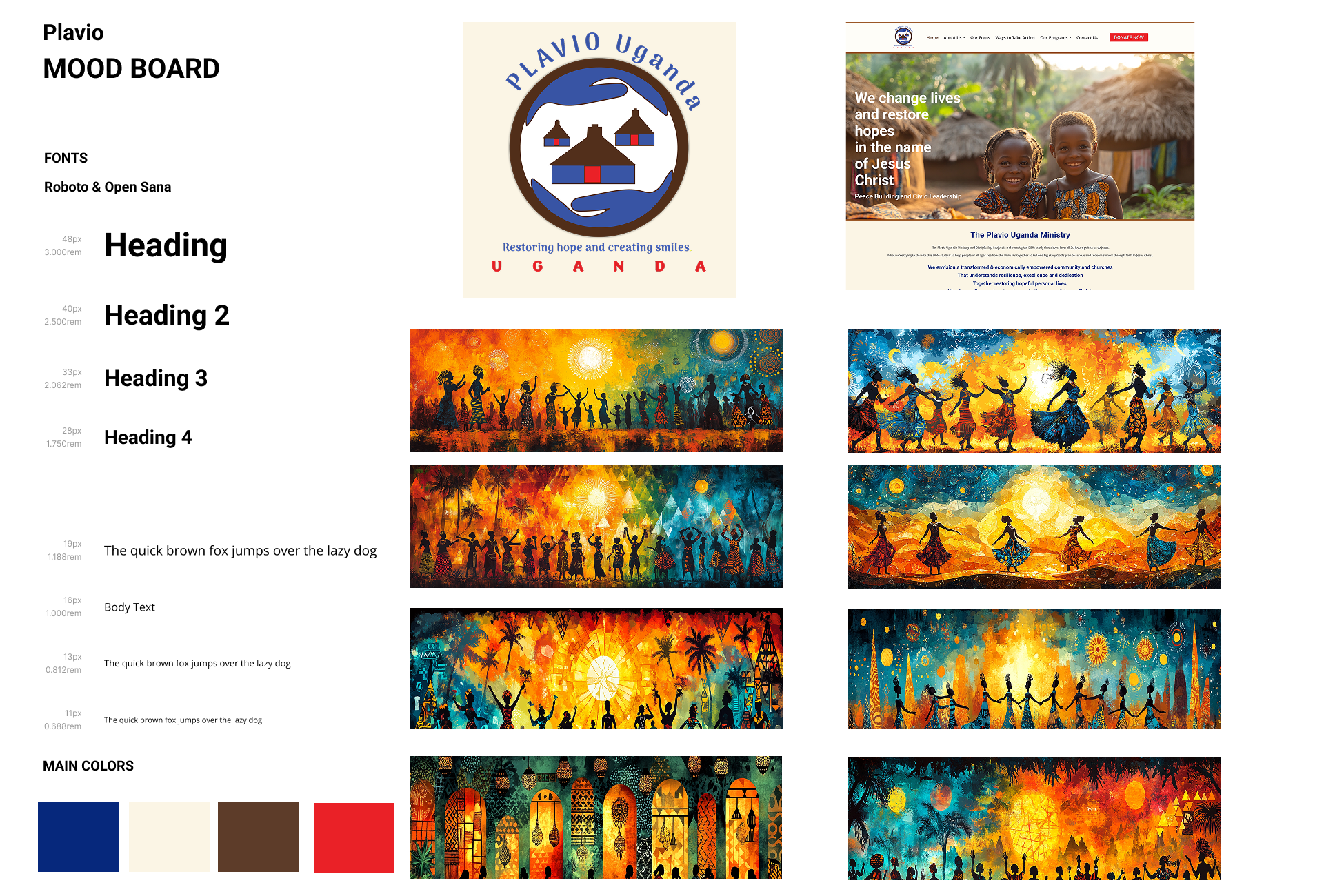 As part of the visual revitalization, I recognized that Plavio Uganda’s existing photo assets didn’t fully capture the spiritual and cultural vibrance of their mission. To enhance the emotional tone of the site and bridge visual gaps where photography was limited, I generated a suite of bespoke illustrations using Leonardo AI.